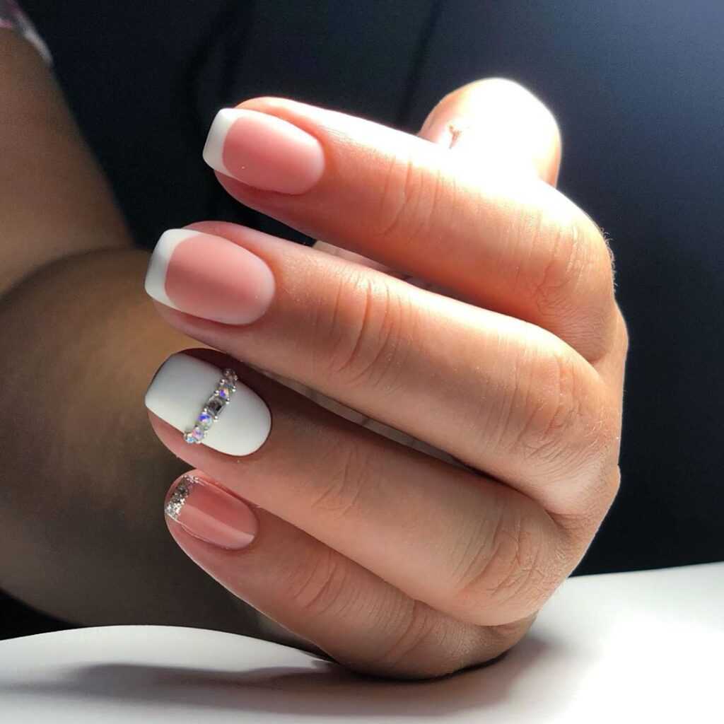 Обычно он дополняется кружевными узорами, флористическими мотивами, художественной росписью, стразами. Такой вариант всегда популярен, так как отличается скромностью и изяществом. Такой маникюр идеально подходит для длинных и средних ногтей. Классические оттенки – полупрозрачный розовый, бежевый, молочный, нюдовый.