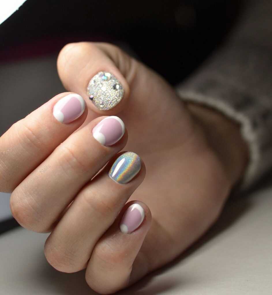 Французский маникюр прекрасно подходит для короткой длины. Допустимо металлизированное втирание. Ею покрывают два ногтика либо выделяют улыбку. Можно сделать сияющий дизайн при помощи манипуляций с жемчужной.