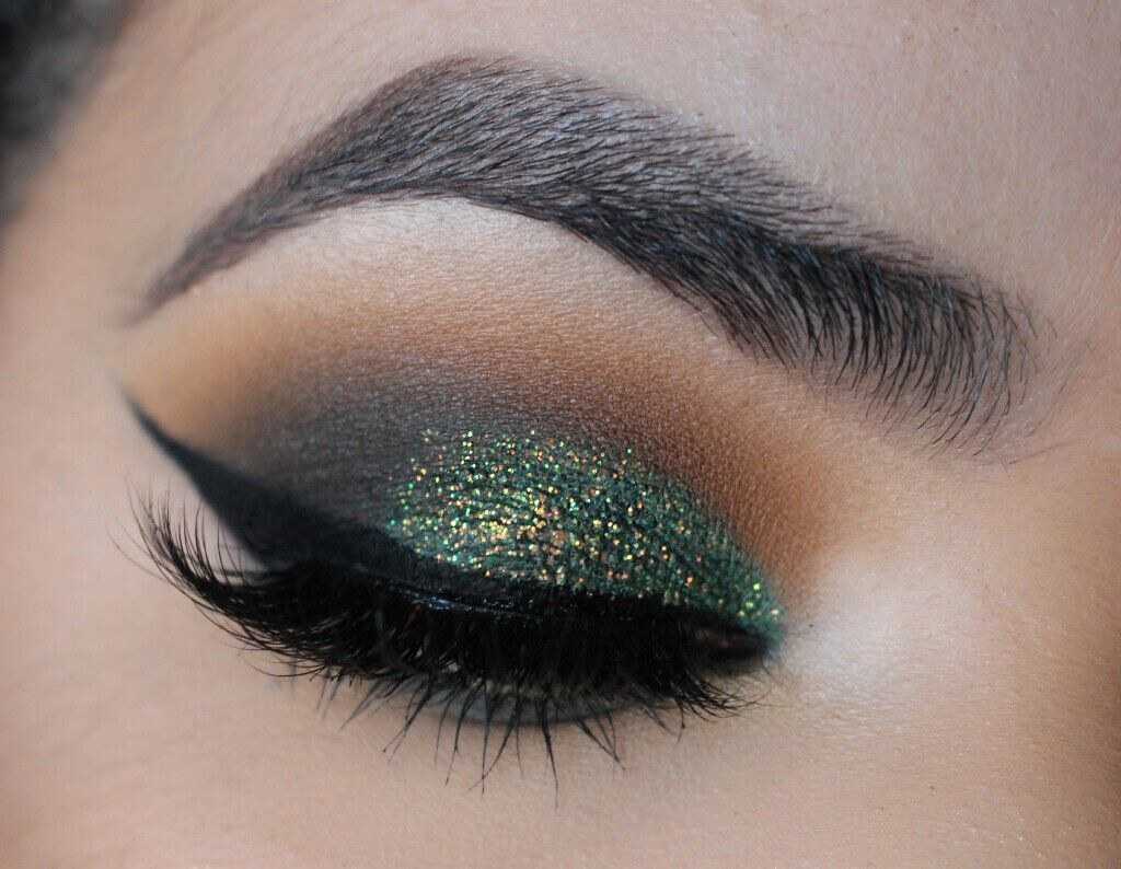 По цветам ограничений нет — либо продолжаем буйство красок, либо используем золотистые оттенки с блестками, подчеркивающие глубину карих глаз.