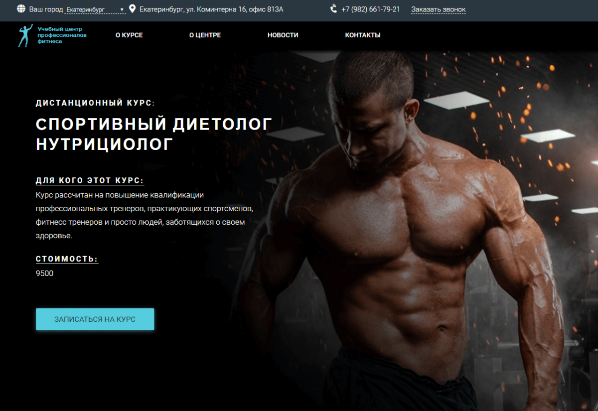 Срок обучения — 98 часов (1 месяц). Занятия длительностью 3-5 часов проходят 3-4 раза в неделю. В курс входят два модуля: «Биологические основы нутрициологии» и «Спортивная нутрицология». Курсанты учатся анализировать состав тела и составлять рационы для различных целей, получают знания об органах пищеварения, их работе и биоэнергетических процессах. Ну и, как водится, о спортивных биодобавках.