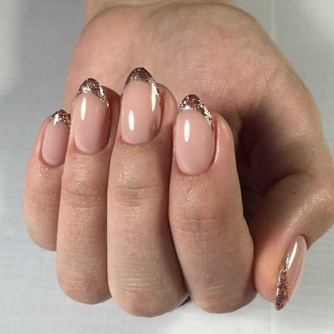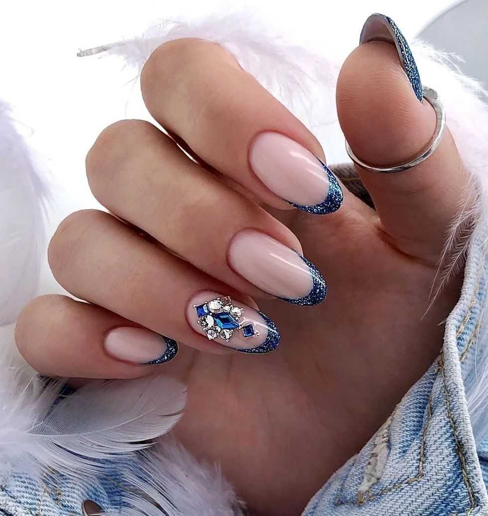 Френч всегда можно дополнить блестящим дизайном — блестками или стразами. Сверкающим декором выделяют улыбку или другую зону ногтя. Если хотите сделать дизайн в стиле минимализм, используйте минимальное количество камней и глиттера. Если маникюр нужен для праздника — не ограничивайте себя.
