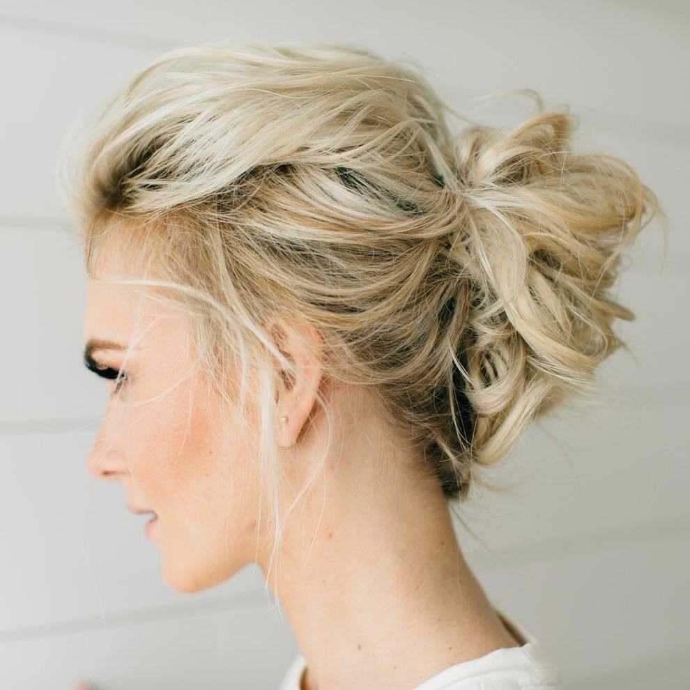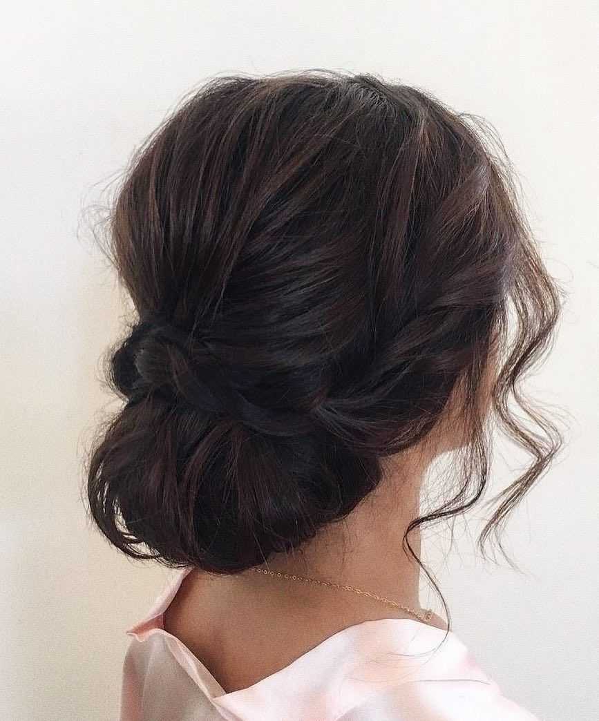 Пучок в небрежной технике исполнения позволит сделать образ чуть более расслабленным. Такой вариант наиболее часто выбирают в том случае, если платье летящее, но в то же время элегантное. Для создания такой прически чаще всего волосы завивают на крупные локоны. Это нужно для того, чтобы она получилась более объемной и воздушной. После чего волосы собирают в пучок, вытягивая несколько прядей у лица и сбоку. Такие детали всегда придают образу романтичности. При желании можно добавить небольшие украшения со стразами или бусинами. Это будет уместно в том случае, если на платье отсутствует дополнительный декор. Нередко прическу украшают специальными декоративными цветами небольшого размера. Благодаря таким деталям образ невесты становится еще более утонченным.