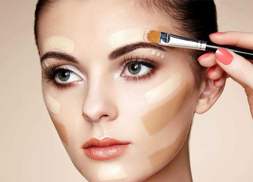 - Специальные кисти для визажа лица продаются в большом многообразии форм и материалов. Так, круглая служит для вбивающих движений, а плоская – для линейных. Наиболее аккуратное и незаметное покрытие создается именно этим способом, в том числе сочетая его с другими. С щетины легко удаляются остатки состава, расход средства небольшой. В качестве мольберта вновь используется тыльная сторона ладони. Успешно овладев техникой работы с тональным кремом, можно переходить к свето-теневой коррекции. Используя оттенки светлее и темнее основного фона, можно добиться визуального скульптурирования лица.