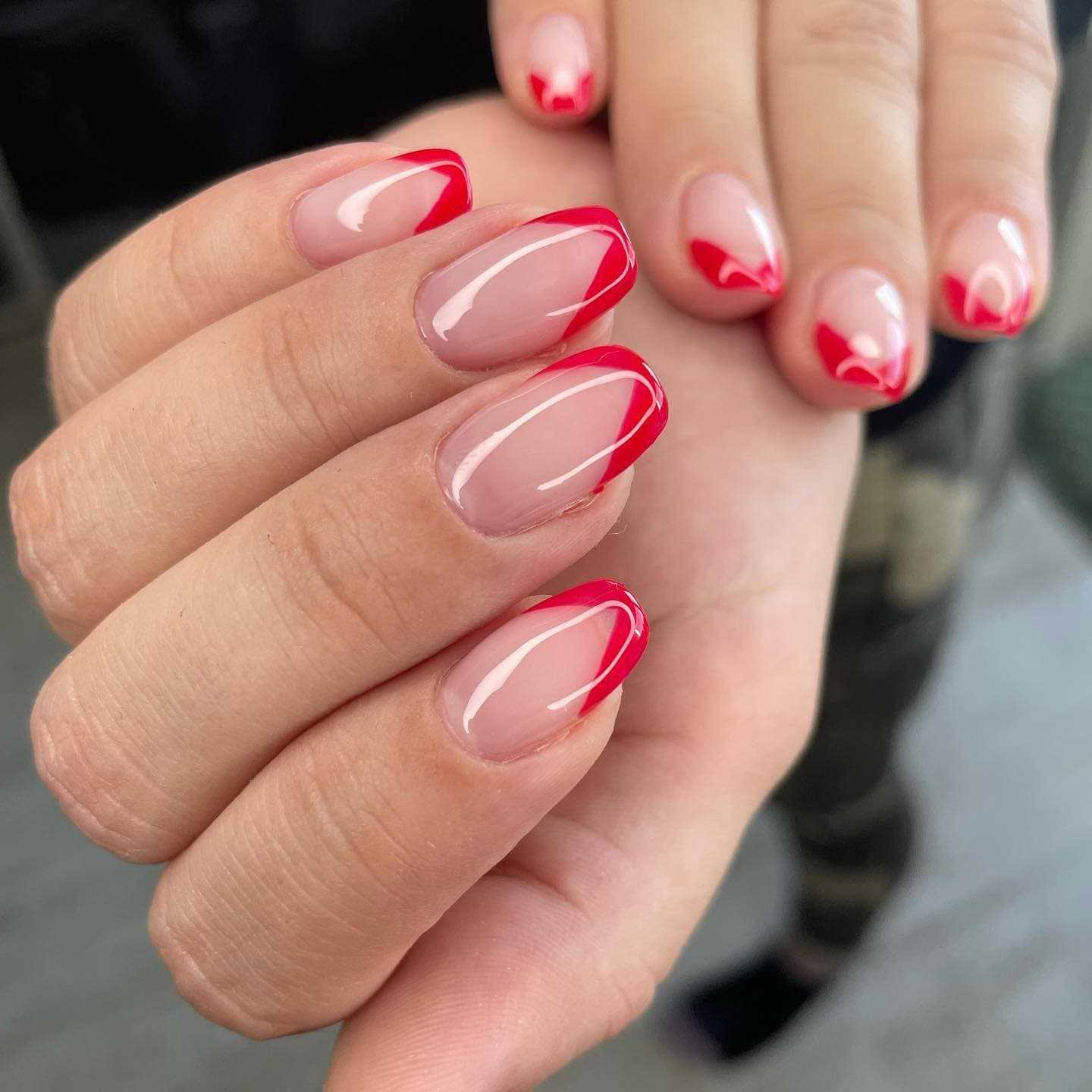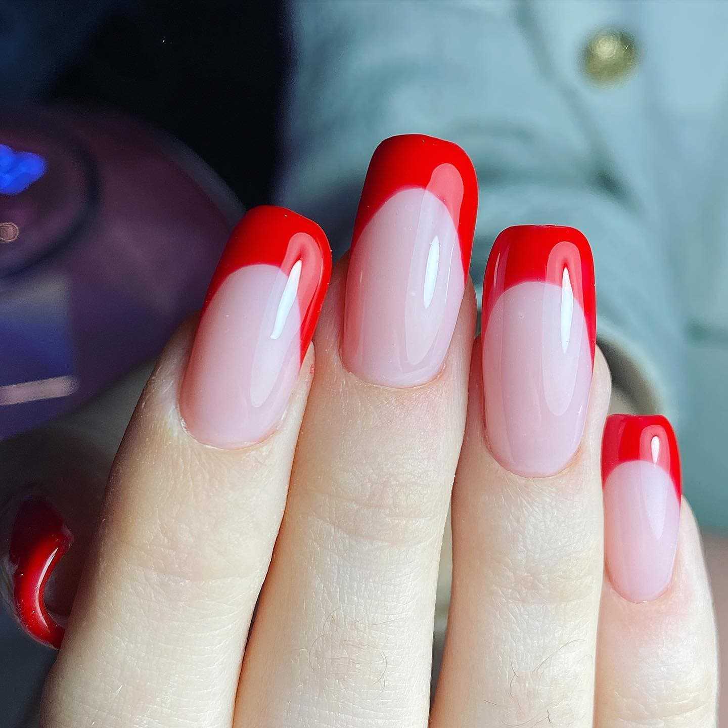 • алый френч – прозрачная основа ногтевого полотна в сочетании с алого цвета изгибами улыбок отлично смотрится на слегка удлинённой квадратной форме ногтей. Дополнить дизайн можно нанесением рисунка или декора на ноготок безымянного и (или) среднего пальцев;• матовый красный с плетёными песочными косами – довольно модный и актуальный дизайн текущего и, соответственно, будущего сезона 2022-2023, проявляющийся в бархатистом нанесении яркого красного с последующим водружением на его поверхность песочного узора в виде плетения;• прозрачный градиент – техника нанесения красного шеллака или гель-лака в стиле омбре, плавно сходящего на нет в градуированном своём переходе, очень красиво смотрится в перламутровых переливах с обязательным нанесением пигмента на линию среза и оставлением в естественном виде прикорневой прозрачной зоны.