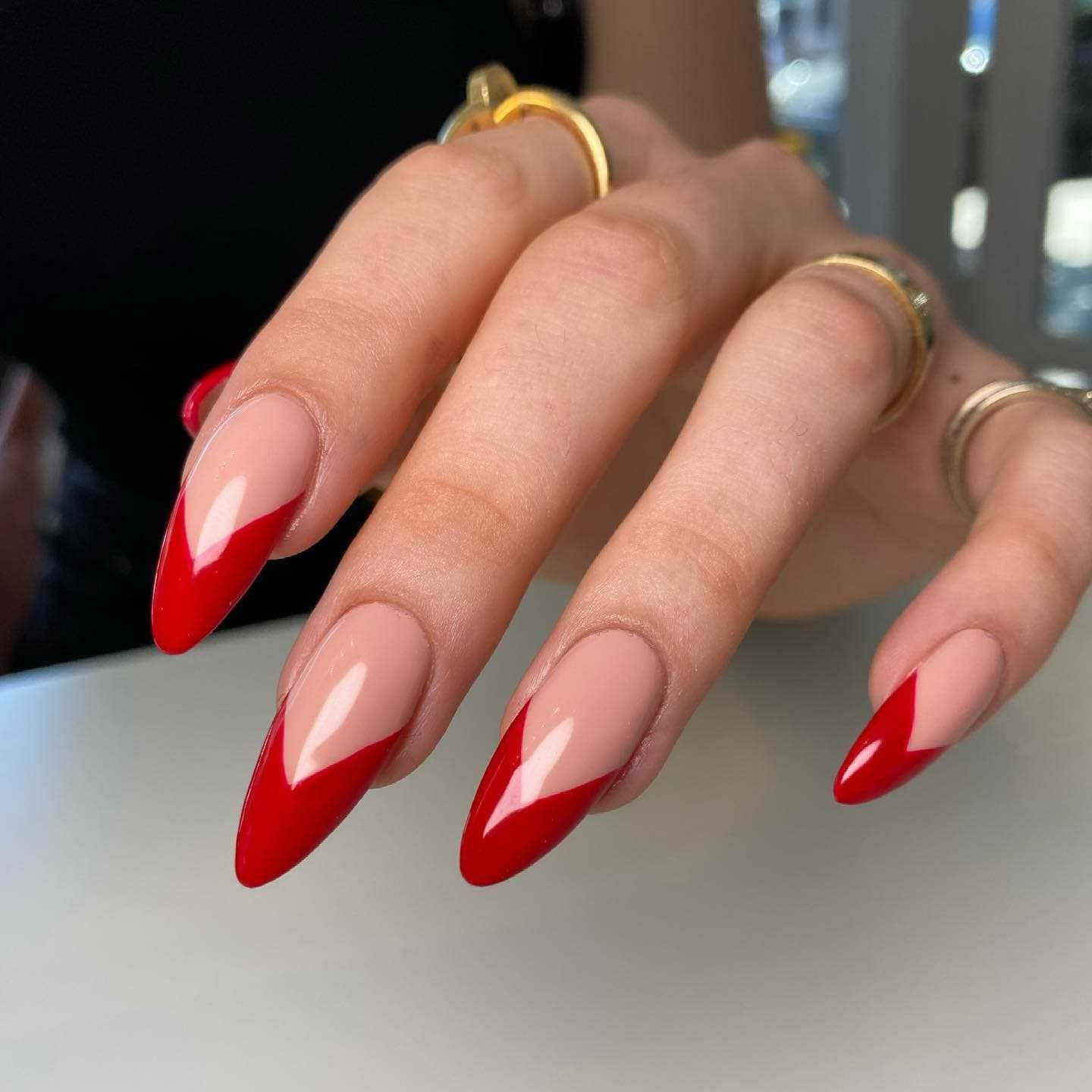Мы все знакомы с классическим французским маникюром – классическая основа с белыми кончиками. Чтобы придать вашему французскому маникюру новое и классное обновление, поменяйте белый цвет – на красный. В результате получается сексуальный и утонченный вид ногтей, который простой, но в то же время шикарный. Красный французский маникюр идеально подходит для вечеринки или работе в офисе. Это также один из самых универсальных вариантов. Попробуйте сделать его с овальной или миндальной формой ногтей.