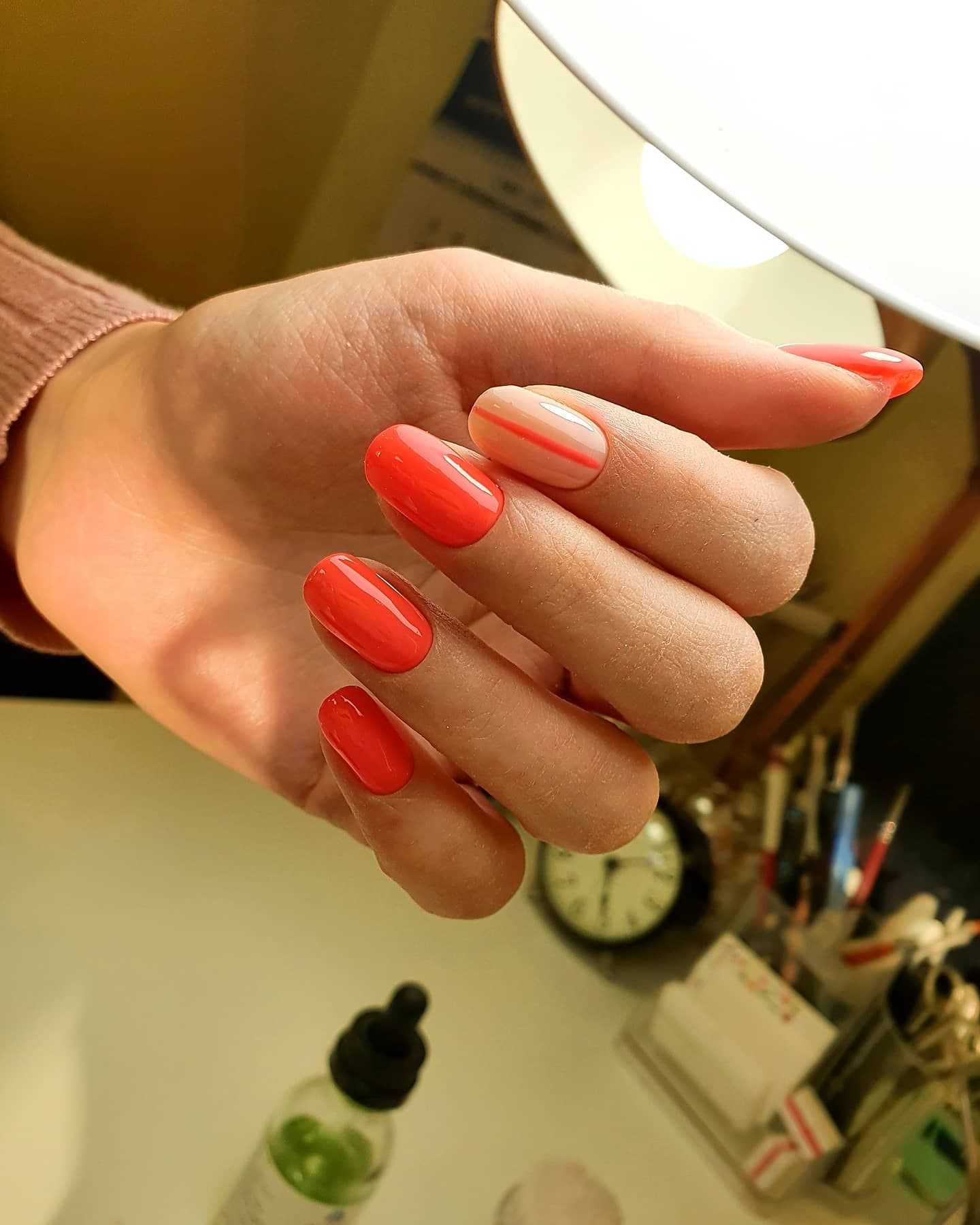 Необычное сочетание цветов для вашего маникюра – красный и пастельный. Попробуйте добавить кораллово-красный ноготь, сохранив остальную часть ногтей в розово – пастельной палитре оттенков