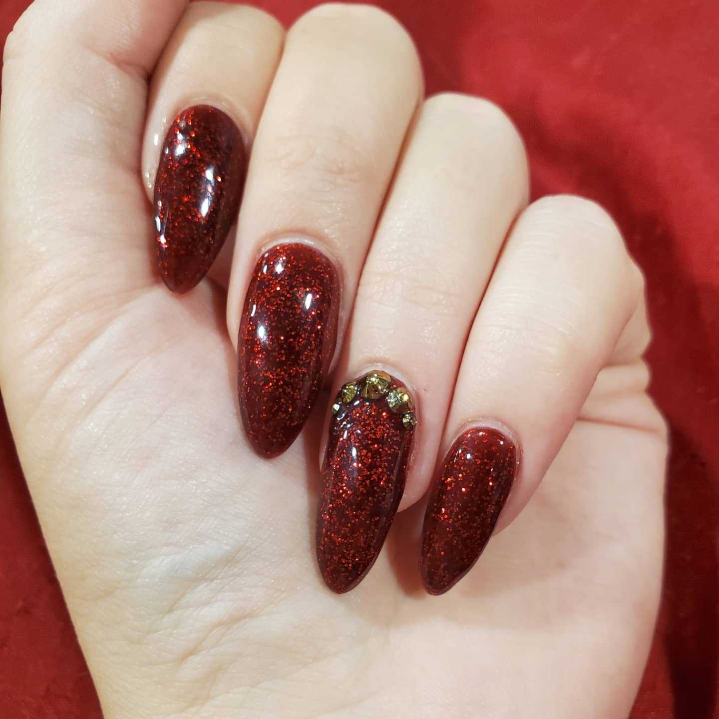 • геометрическая абстракция – довольно часто нынче используются ленточные полосы в виде тоненькой фольги, накладываемой в различных абстрактных пересечениях на ноготки; взятый за основу алый глянец будет служить отличным фоном для раскинутых по ногтевому пространству прямых золотых линий, пересекающихся под прямым углом и не только;• алый лунный – интересным дизайном считается прорисовка красным цветом основного покрытия (это может быть как мат, так и глянец) и выделение узорчатым рябым золотым манером улыбок обратного французского маникюра: полукруги роскошных золотых лунул с завитками смотрятся очень аристократично и элегантно;• золотые бульонки – отличным решением служит также выкладка в форме праздничных бантов из золотых бульонок на фоне бурого красного основного покрытия. Такой декор можно приукрасить эффектом со стразами: в серединку имитированного бульонистого банта или цветка всадить центральный камешек, который будет оттенять серединную часть декора и внесёт свою нарядную лепту в общий образ;• россыпь шиммера и глиттера – невероятно эффектно выглядят на красной основе рассыпанные в прикорневой зоне или, наоборот, в области среза блёстки в крупном или мелком своём напылении. Такой маникюр подойдёт для праздничной вечеринки или выхода в свет с обязательным использованием аксессуаров в подобной цветовой гамме.