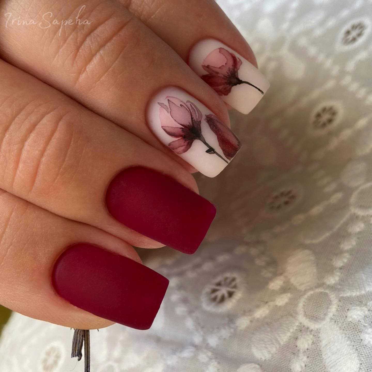 Наиболее востребованы для маникюра в красных тонах «переводилки», которые позволяют получить отличный вариант, сэкономив время мастера.
