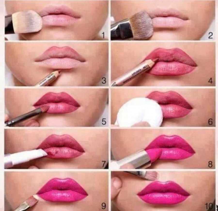 Нанести силиконовую базовую основу для губ.Нанести тонким слоем пудру или тональный крем.Обвести контур губ карандашом. Цвет контура должен быть на пол тона темнее цвета губной помады.Чтобы создать визуальный эффект припухлости губ, нужно контурным карандашом поставить жирную точку по центру нижней губы, мягко растушевать её по ходу контура.Не рекомендуется красить губы помадой. Краску лучше наносить специальным аппликатором или кистью.После нанесения основного цвета рекомендуется нанести гель или бальзам для губ. Этот приём придаст губам естественный блеск.
