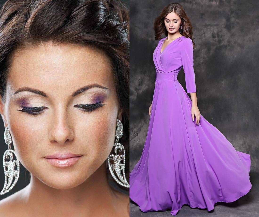 Девушкам, которые имеют кожу естественных тонов, рекомендуем воспользоваться такими цветами теней, как цвет винограда или сливы. Такой яркий макияж глаз можно скомпенсировать с помощью очень светлого блеска для губ. А вот представительницам темных тонов кожи предлагаем использовать тени и подводку цвета сливы. Сливовые оттенки очень выгодно подчеркнут не только цвет фиолетового платья, но и цвет кожи. Что касается губ, то лучше всего подойдет прозрачный блеск или блеск розового цвета.