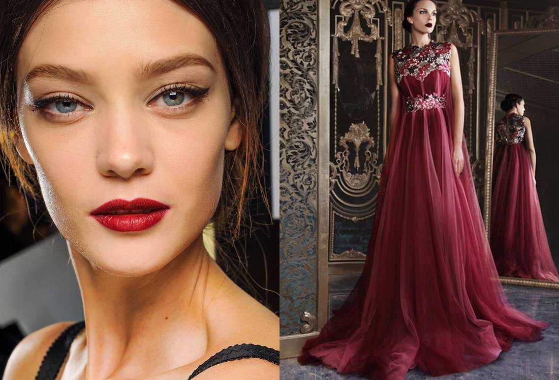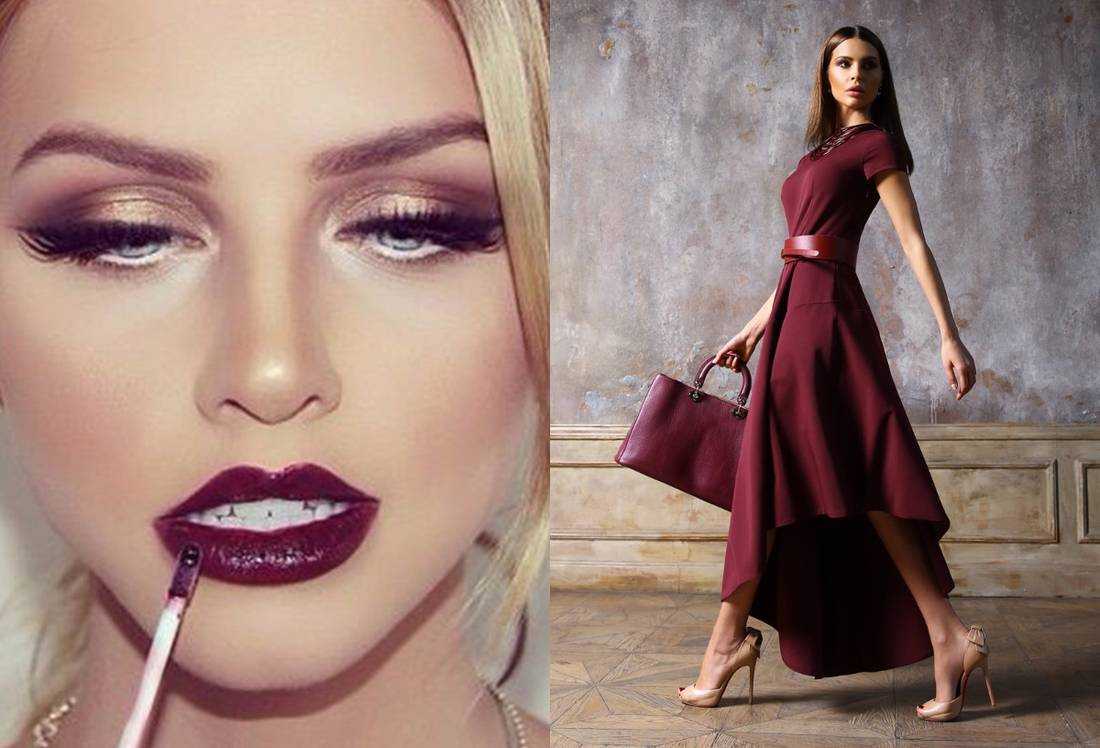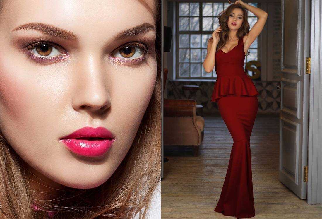 Желательно выбирать для него нюдовые оттенки. Яркие губы отлично дополнят как темно-бордовое, так и бордовое платье.