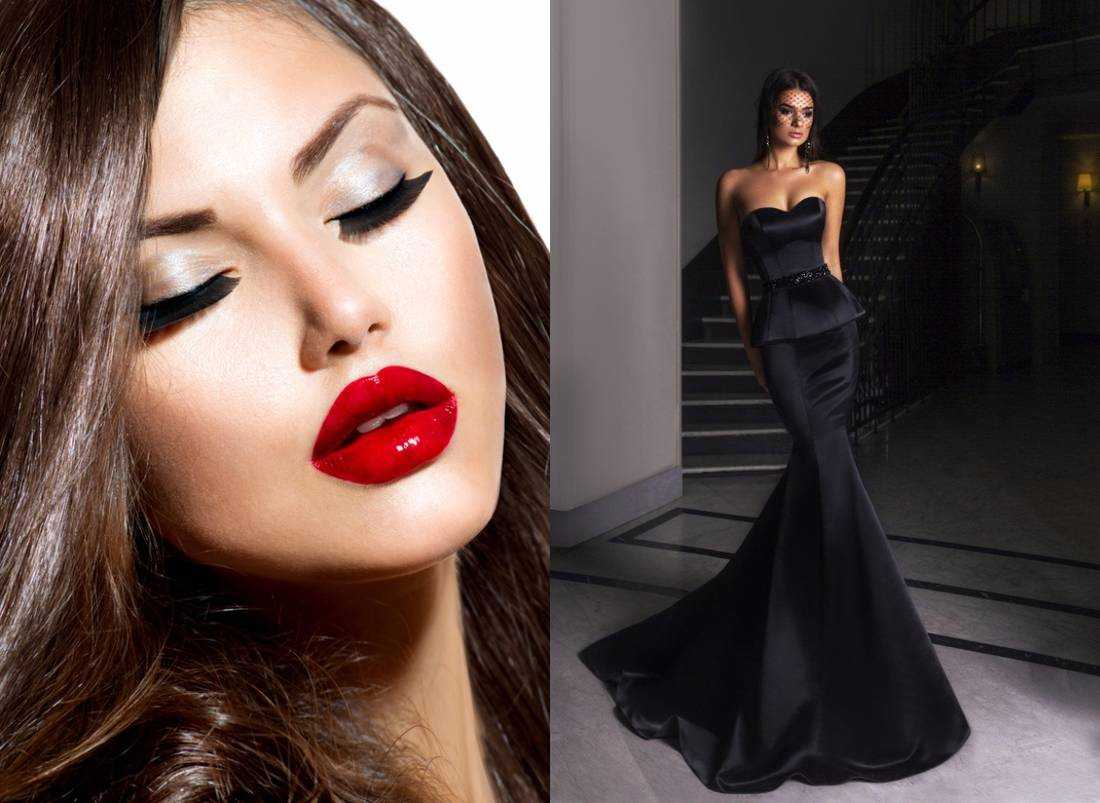 Более смелые и уверенные девушки используют в макияже губ градиентные помады от черного к красному и яркие алые, которые повторяют цвет наряда. Желательно, чтобы цвет помады совпадал с цветом платья (хотя это касается не всех цветотипов) или был более насыщенным, но не слишком ярким.