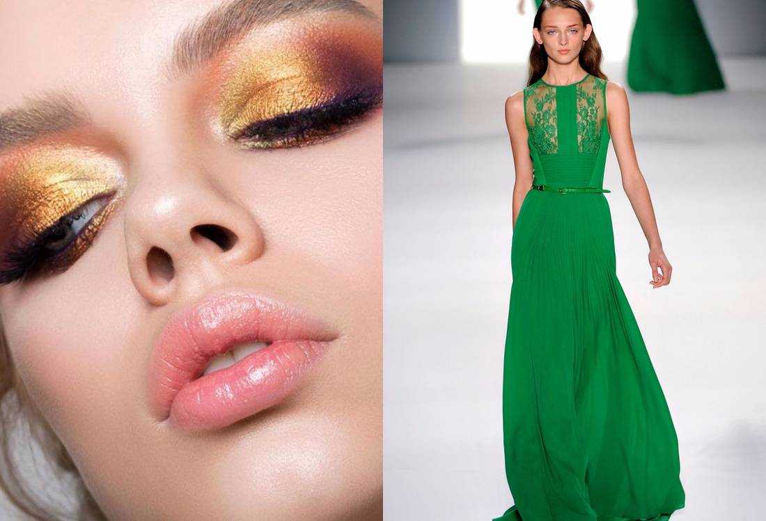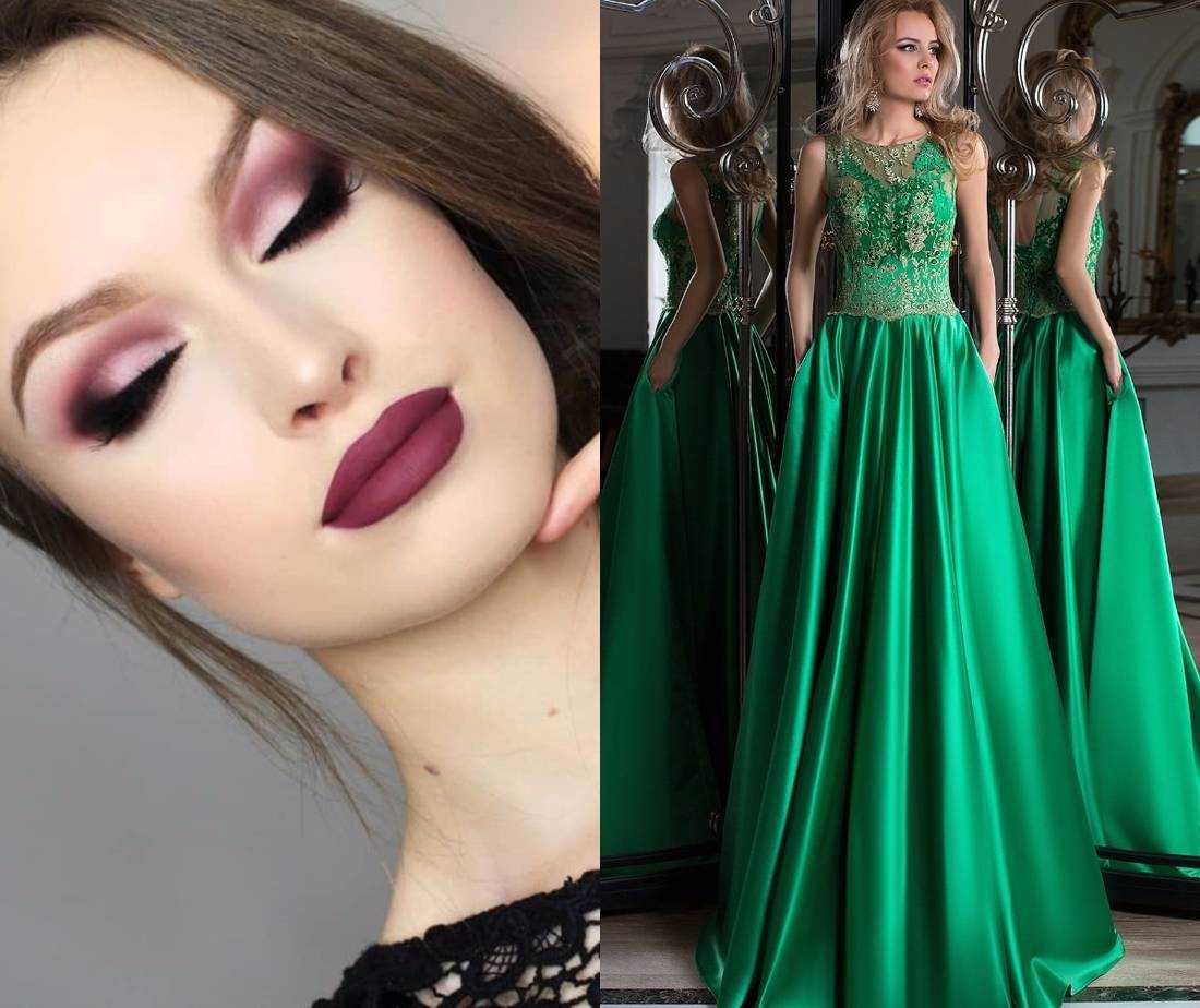 Макияж к платью такого цвета должен содержать в себе оттенки пурпурного и сливового. Тени могут быть золотыми или коричневыми, но только не зелеными. Иначе вы будите походить на этакую тропическую лягушку.