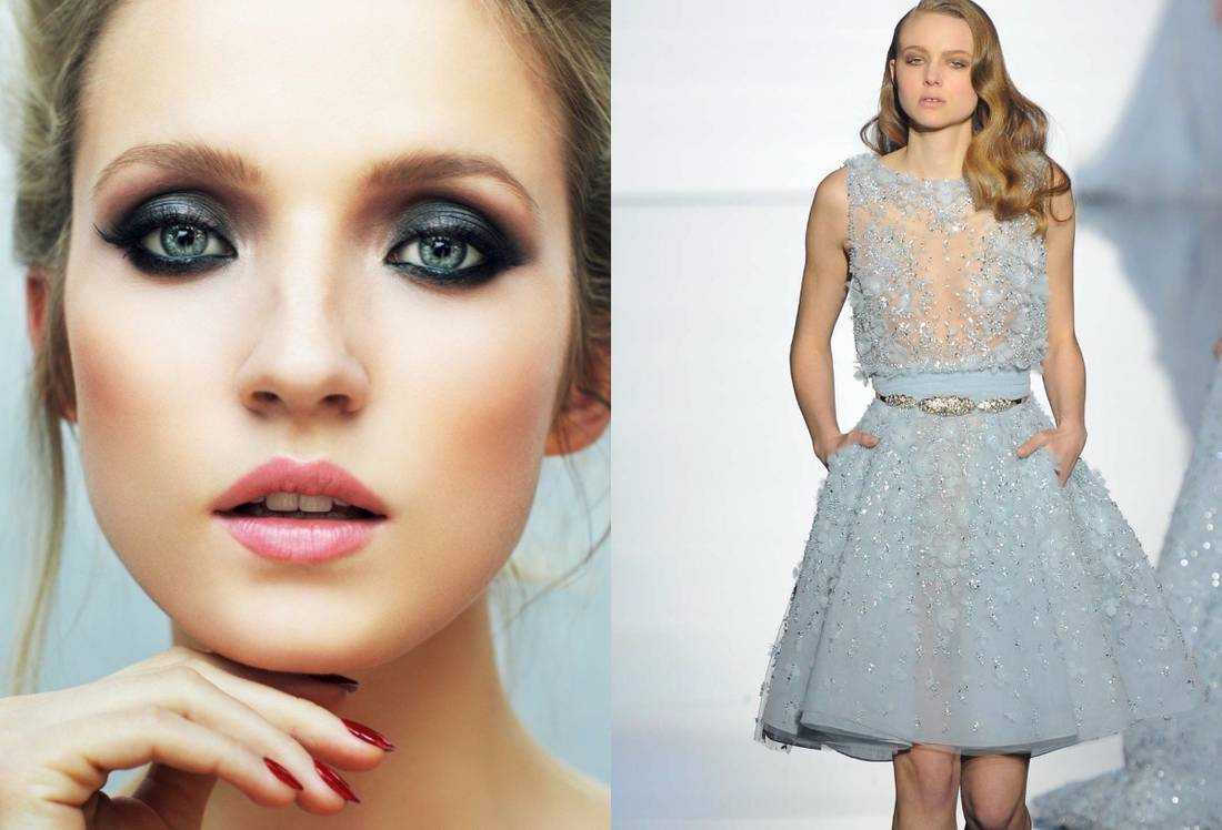 Холодный оттенок наряда подходит всем. Правильным макияжем стоит создать романтичный или неприступный образ. Тени стоит выбрать серебристых оттенков, а выразительность глаз подчеркнуть черными стрелками. Тушь выбирайте исключительно черного цвета.