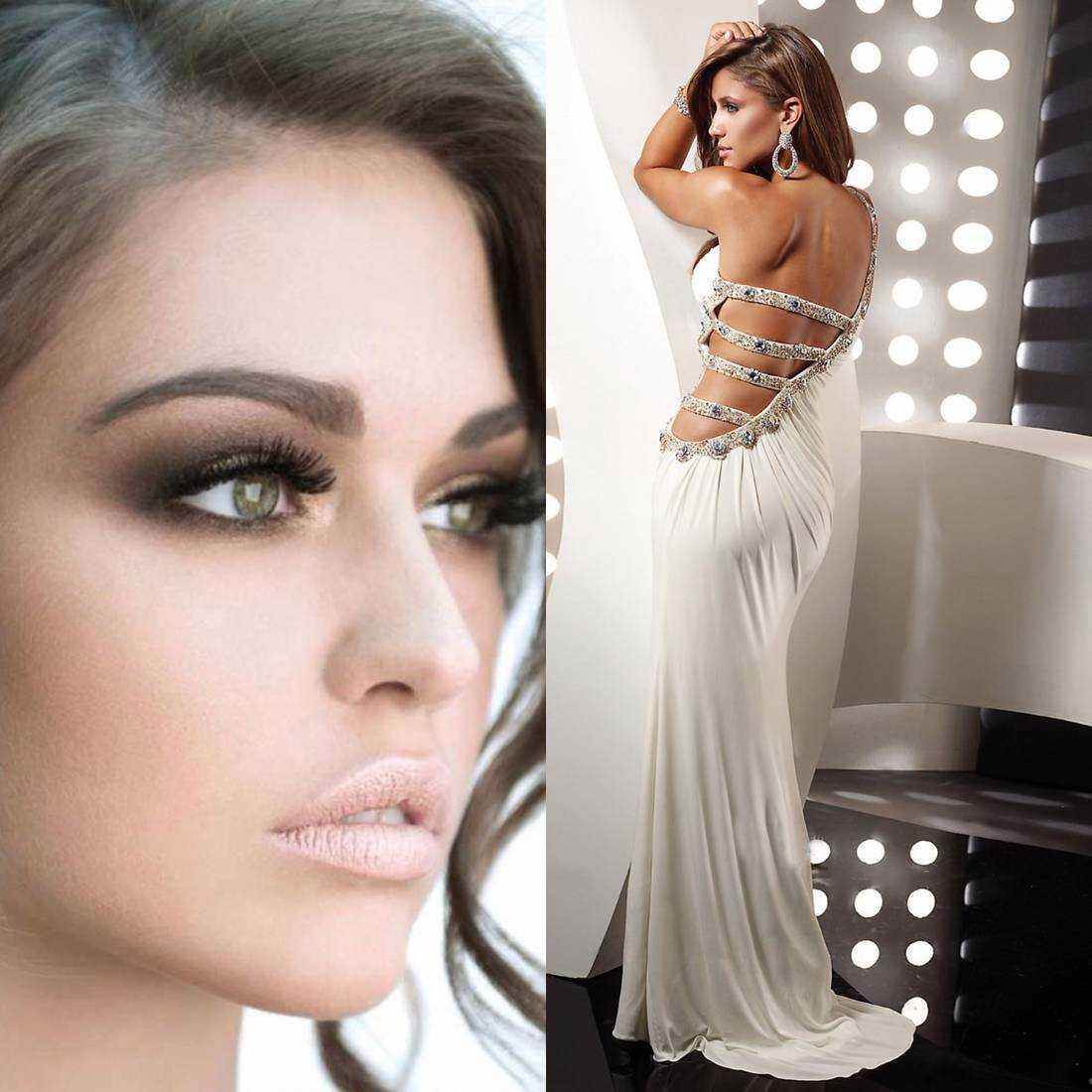Акцентировать внимание на прическе и платье позволит макияж nude. Чтобы make up не сливался с нарядом, добавьте ему блеска