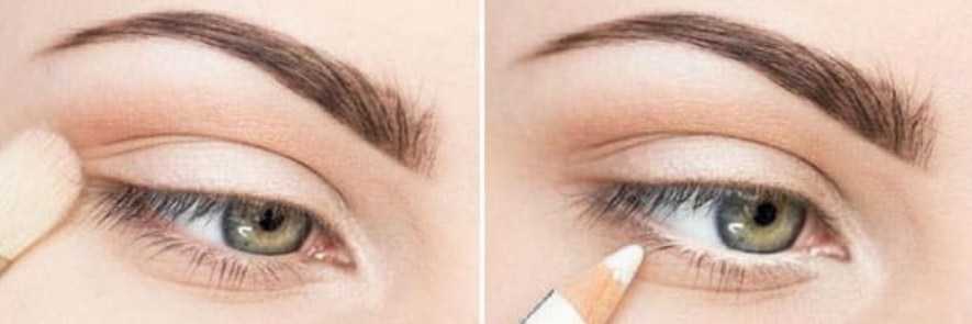 - Маленькое веко выделяем светлым карандашиком, что визуально увеличит размер глаз. Белый карандаш можно использовать в качестве основы для пастельных и ярких теней. Темные лини на нижнем веке уменьшают глаза.
