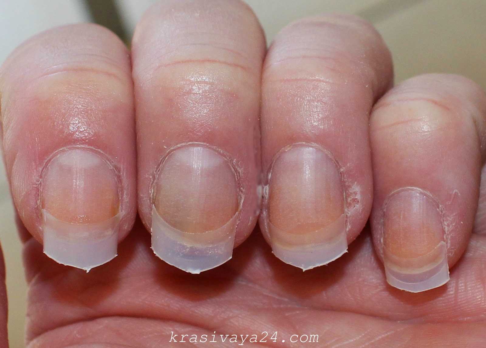 При перенашивании материала он теряет свои свойства, нарушается адгезия, появляются микротрещины по всему периметру, которые приводят к отслойкам и сколам, и даже к повреждению верхних слоев натурального ногтя.