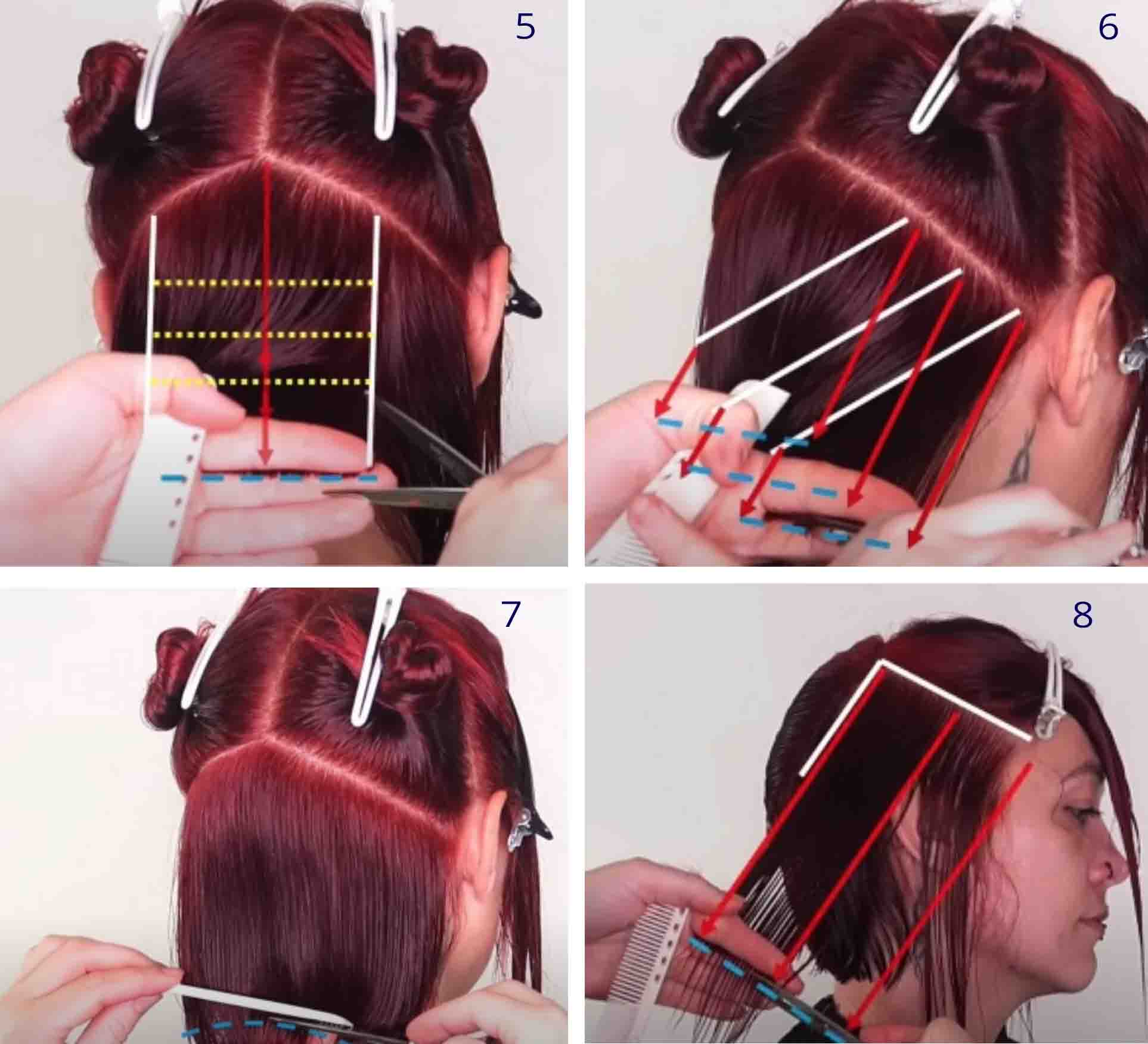 - На затылке волосы срезают на уровне подбородка, на узкой полоске над шеей – на нет. В результате сзади образуются 2 ровные линии. Верхняя, которая находится немного выше мочек, является нижним контуром объемной части стрижки.