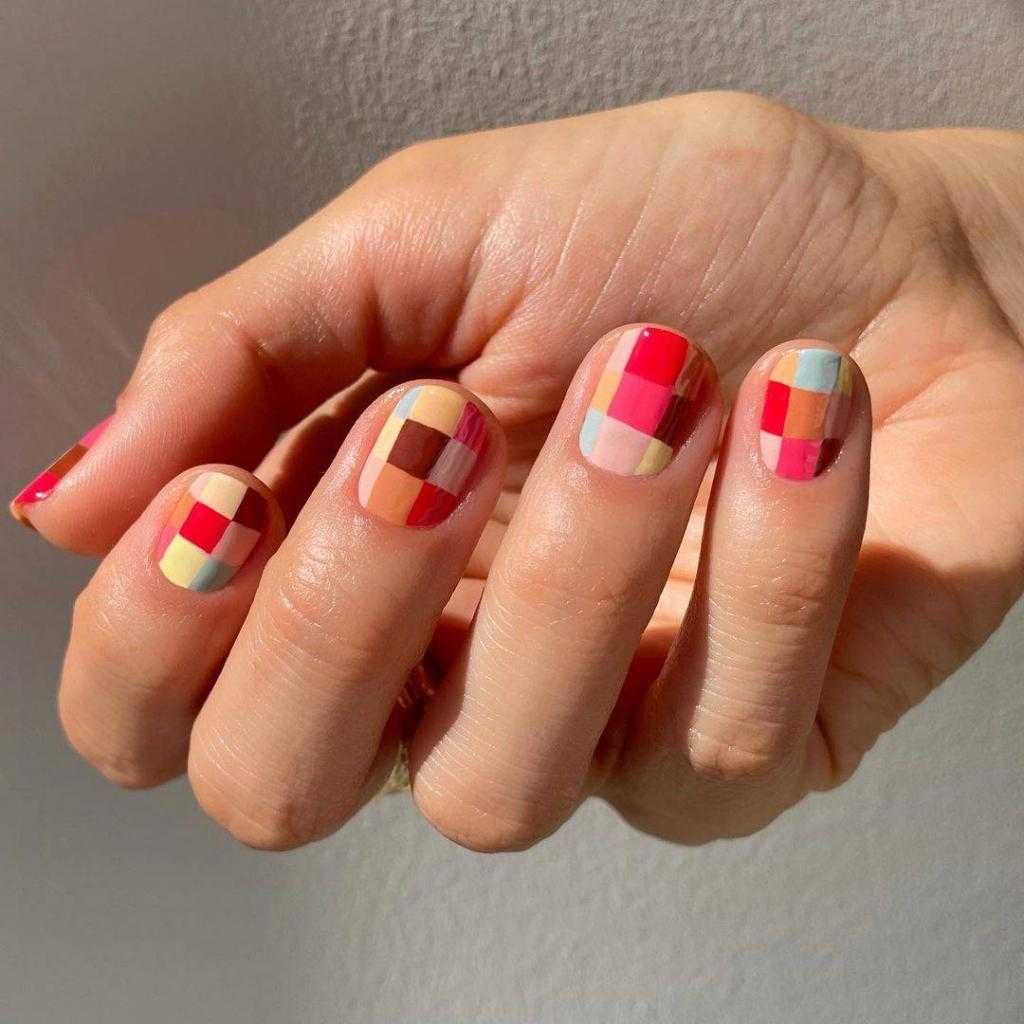 На коротких ногтях разноцветные квадраты будут смотреться задорно и весело. Это хорошее дополнение на период осенней хандры, когда хочется просто отгородиться от всего мира и закрыться дома. Для деловых женщин хорошим выбором будет простая бежевая или прозрачная основа с акцентом на форме. Для акцентирования можно использовать блестящие или темные оттенки.
