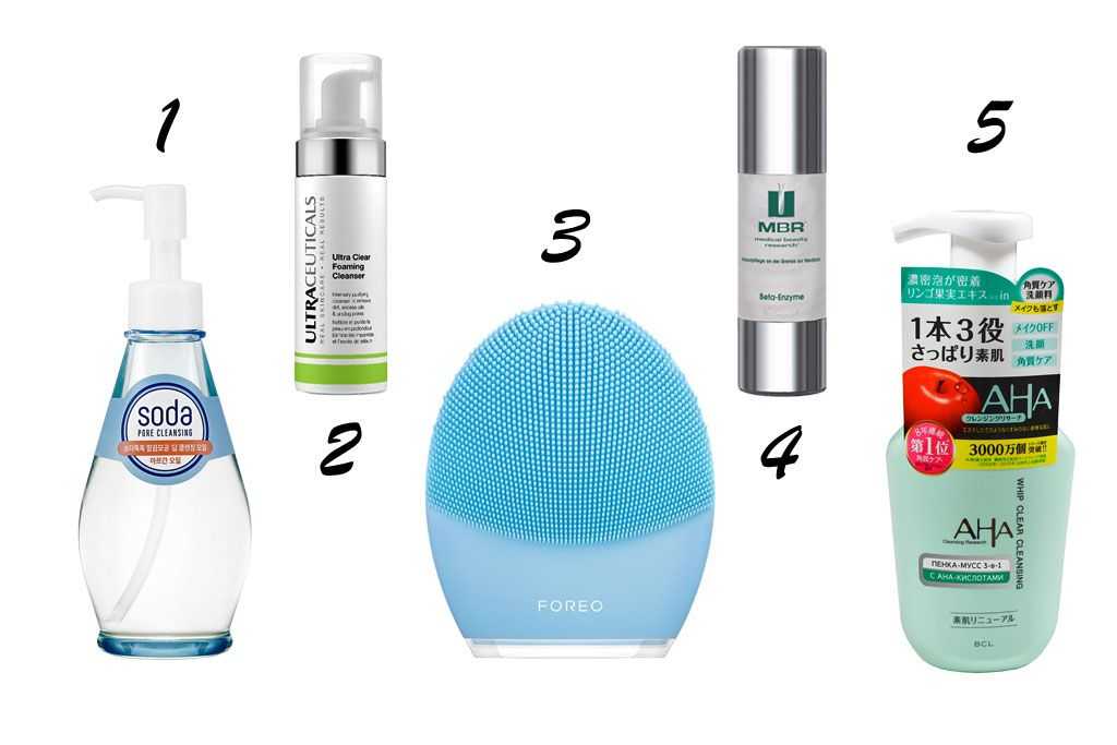 1 — гидрофильное масло для лица Holika Holika, 2 — мягкая пенка для умывания Ultraceuticals, 3 — oчищающая щетка для комбинированной кожи лица Luna 3 от FOREO, 4 — oтшелушивающее средство на базе оксикислот MBR, 5 — пенка-мусс для умывания с фруктовыми кислотами 3-в-1 для нормальной и комбинированной кожи Aha