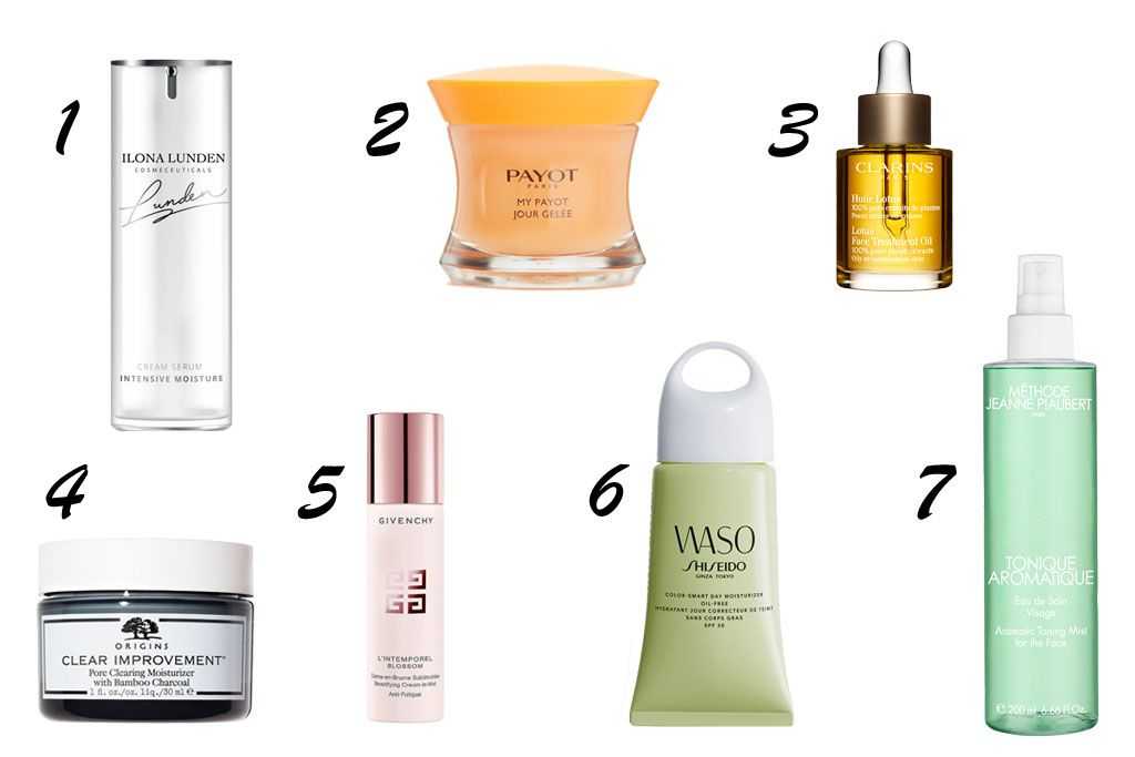 1 — увлажняющая сыворотка для лица Ilona Lunden, 2 — энергетическое желе для лица Payot, 3 — масло для лица для комбинированной или жирной кожи Clarins, 4 — увлажняющий и очищающий поры крем для лица Origins, 5 — дымка против признаков усталости кожи лица Givenchy, 6 — увлажняющий крем для лица с тоном без содержания масел Shiseido, 7 — стимулирующий и защищающий тоник для лица Méthode Jeanne Piaubert