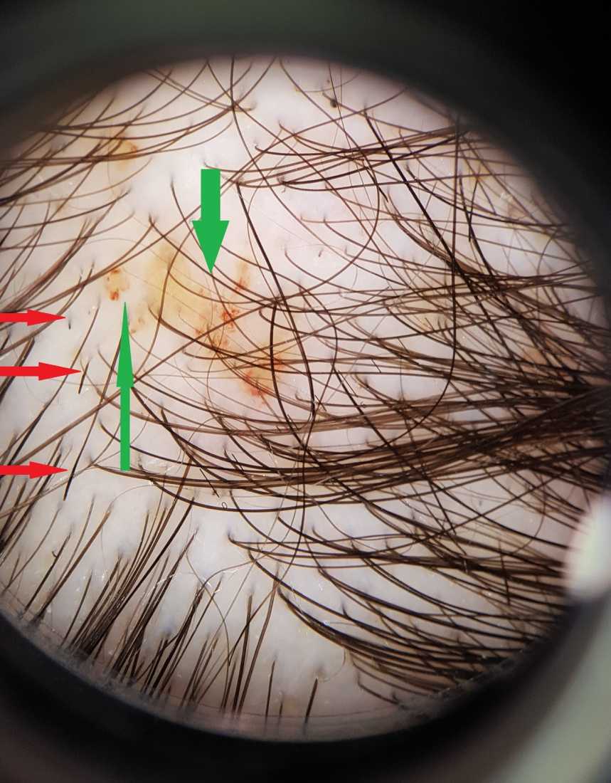 Красные стрелки — оборванные волосыЗеленые стрелки — экскориации |