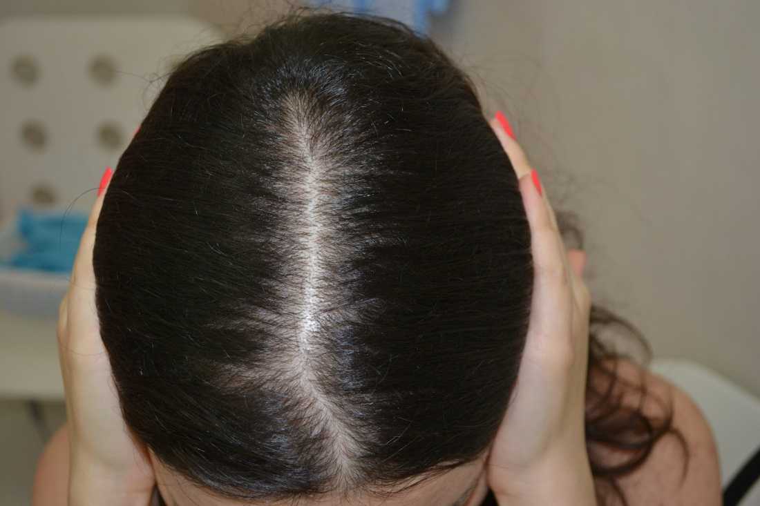 При повторном трихоскопическом исследовании кожи головы в теменной зоне также обнаружены оборванные волоски с расщепленным концом. Это позволило предположить наличие у пациентки трихотилломании.