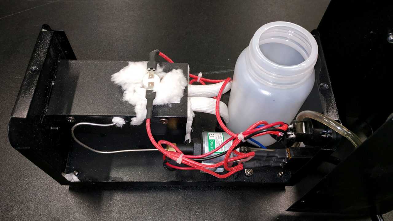 Устройство очень простое и состоит из нескольких элементов: резервуара с жидкостью, помпы и нагревательного элемента (термоблока) с термопредохранителем. Помпа качает и подает жидкость из резервуара в термоблок с трубчатым электронагревателем (ТЭН), где она испаряется и выталкивается из сопла в виде дыма. Термопредохранитель защищает нагревательный элемент от перегрева и расплавления, а в недорогих машинах и контролирует его температуру.