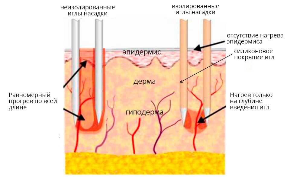 Изолированные иглы проводят ток непосредственно на заданную глубину, где и происходит локальный нагрев необходимого нам слоя для стимуляции выработки и ретракции коллагена.