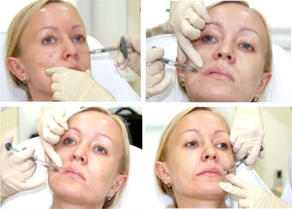- Введение филлера. Косметолог делает по несколько инъекций в каждую носогубную складку;