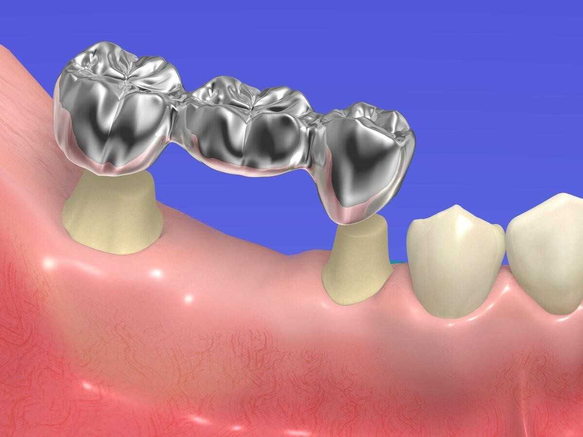 Мостовидный протез состоит только из коронок и промежуточного элемента, корни он никаким образом не замещает