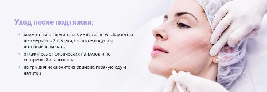 После процедуры возможна незначительная кровоточивость мест проколов, покалывания в местах крепления нитей, неровности кожи, отечность. Все эти симптомы считаются нормальной реакцией тканей на манипуляцию.