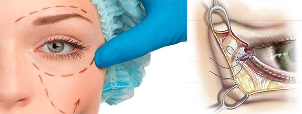 Для удаления излишков кожи нижнего века разрез делается рядом с уголком глаза, часть кожи иссекается, после чего накладываются швы.