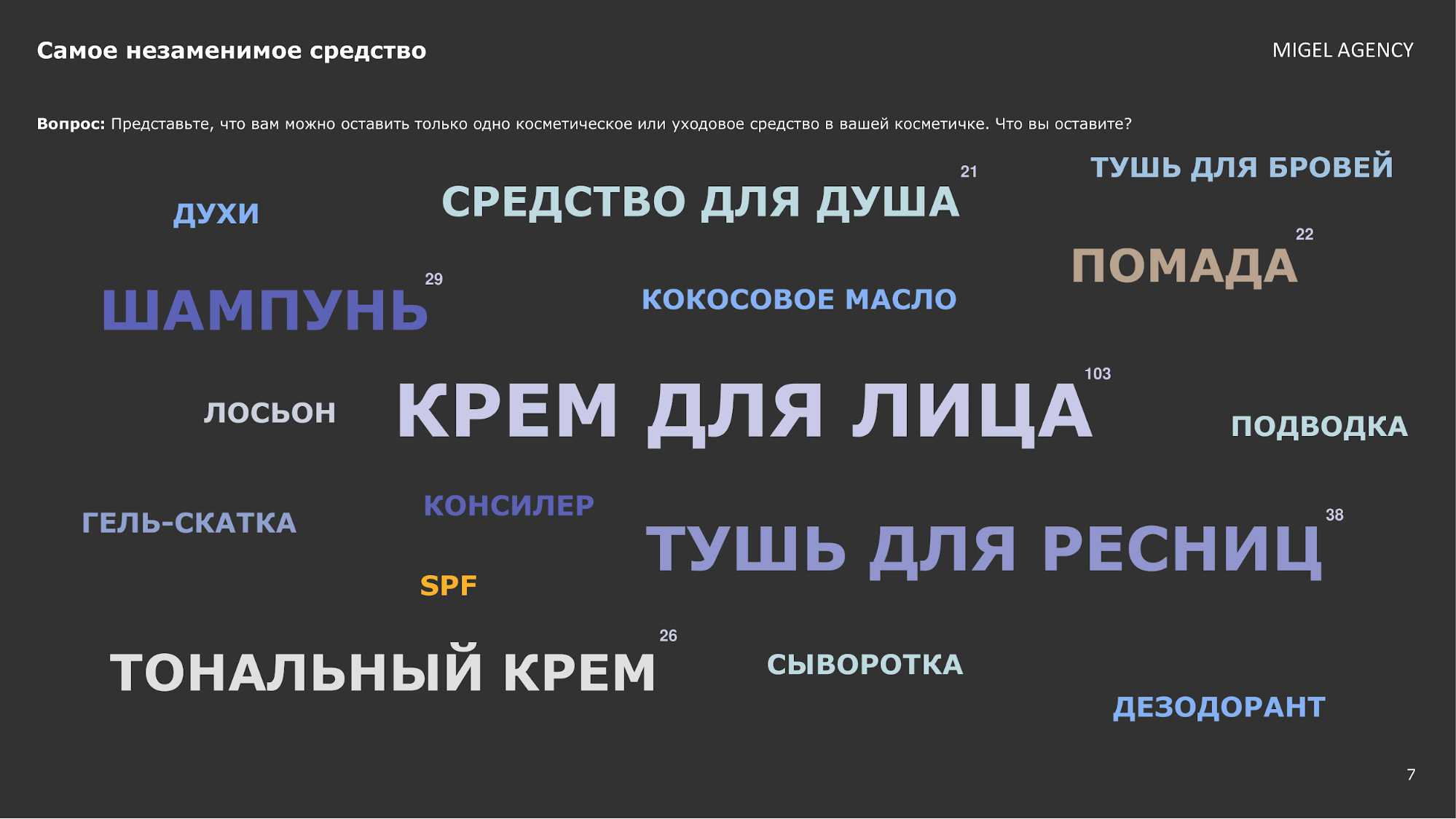 Самым базовым косметическим средством по результатам опроса оказался крем для лица: большинство опрошенных женщин признали его как самое важное средство в своей косметичке. За ним следуют тушь для ресниц, шампунь, тональный крем и средство для душа.