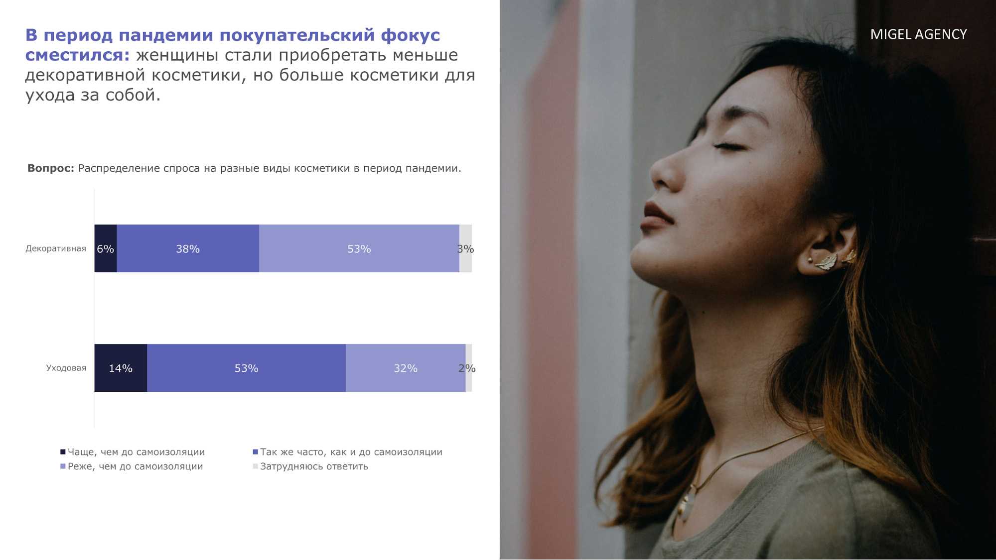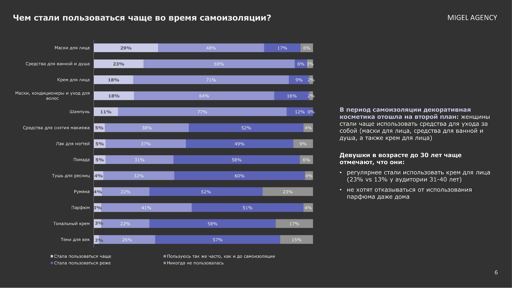 Очевидно, что таким изменениям поспособствовала самоизоляция: женщины стали реже пользоваться декоративными косметическими средствами из-за уменьшения коммуникации с людьми офлайн.