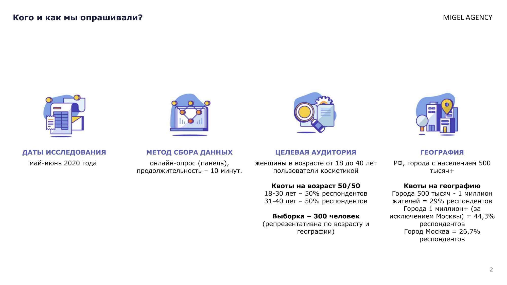 В исследовании принимали участие женщины в возрасте от 18 до 40 лет из разных городов РФ с населением более 500 тысяч человек. Часть вопросов предполагала выбор сразу нескольких ответов. В итоговых результатах учитывались ответы только тех респондентов, которые пользовались декоративной косметикой и уходовыми средствами в течение последних 6 месяцев.
