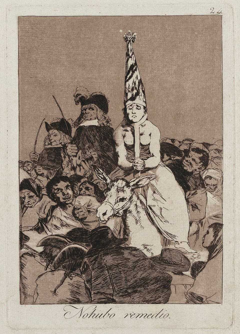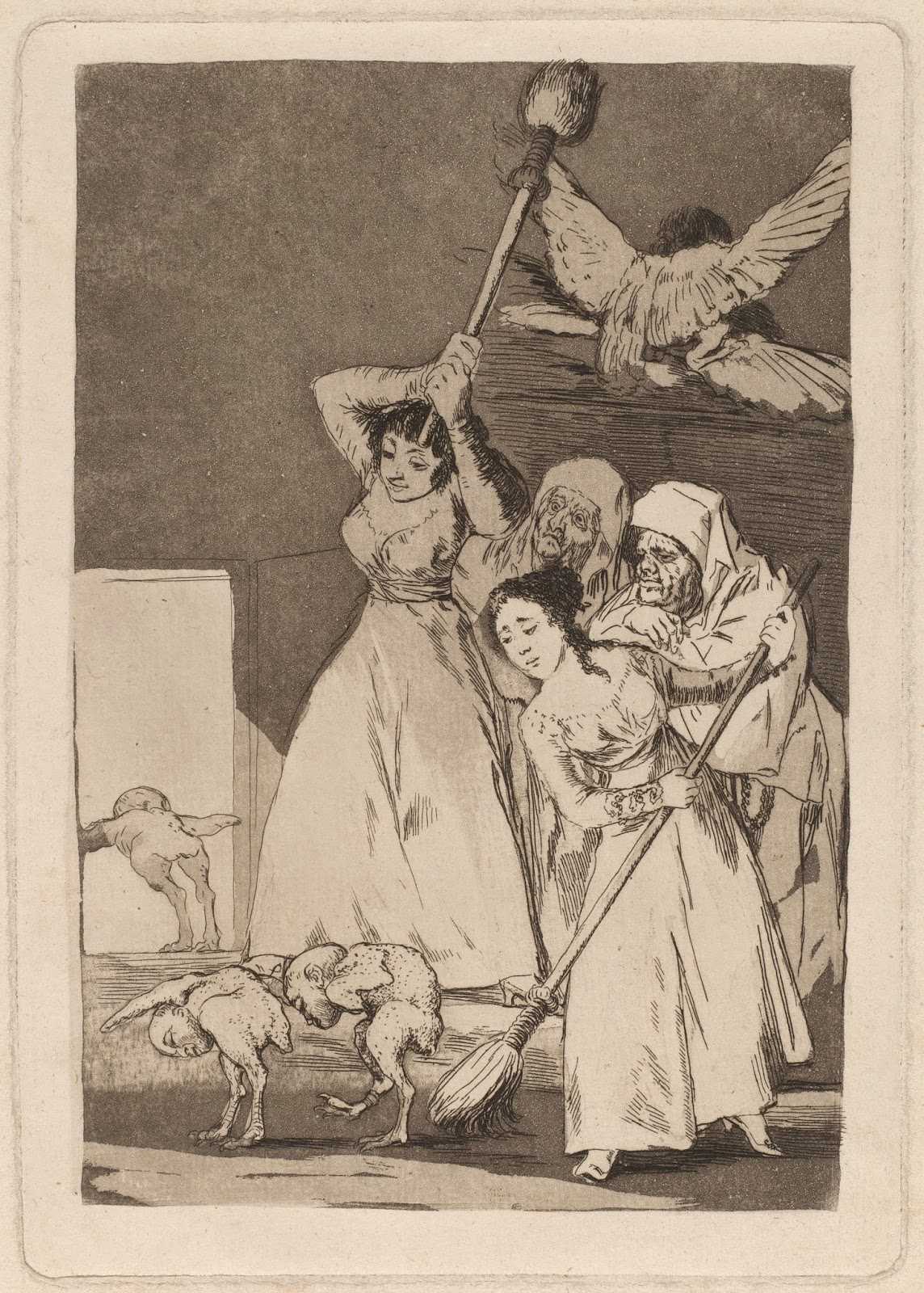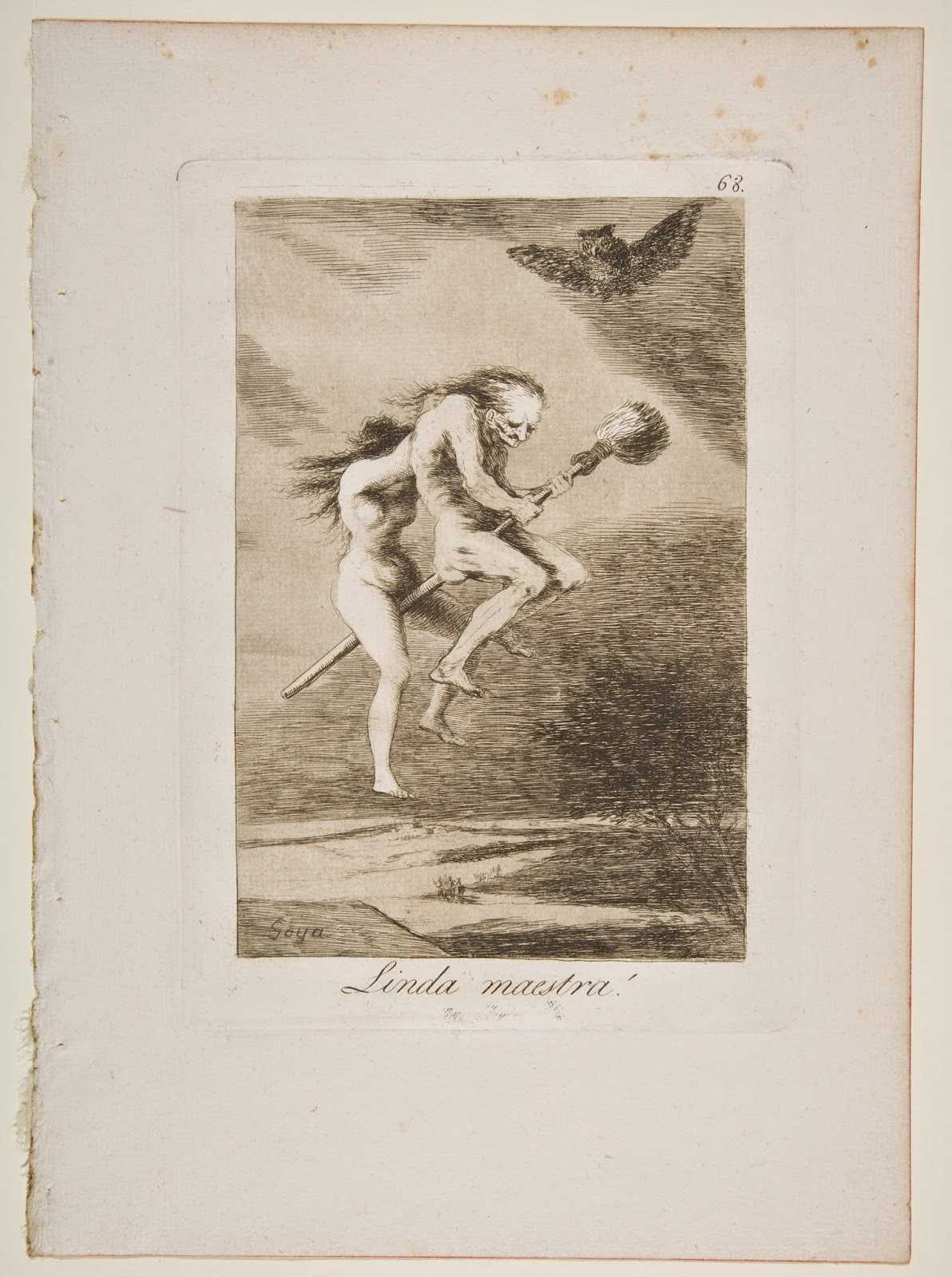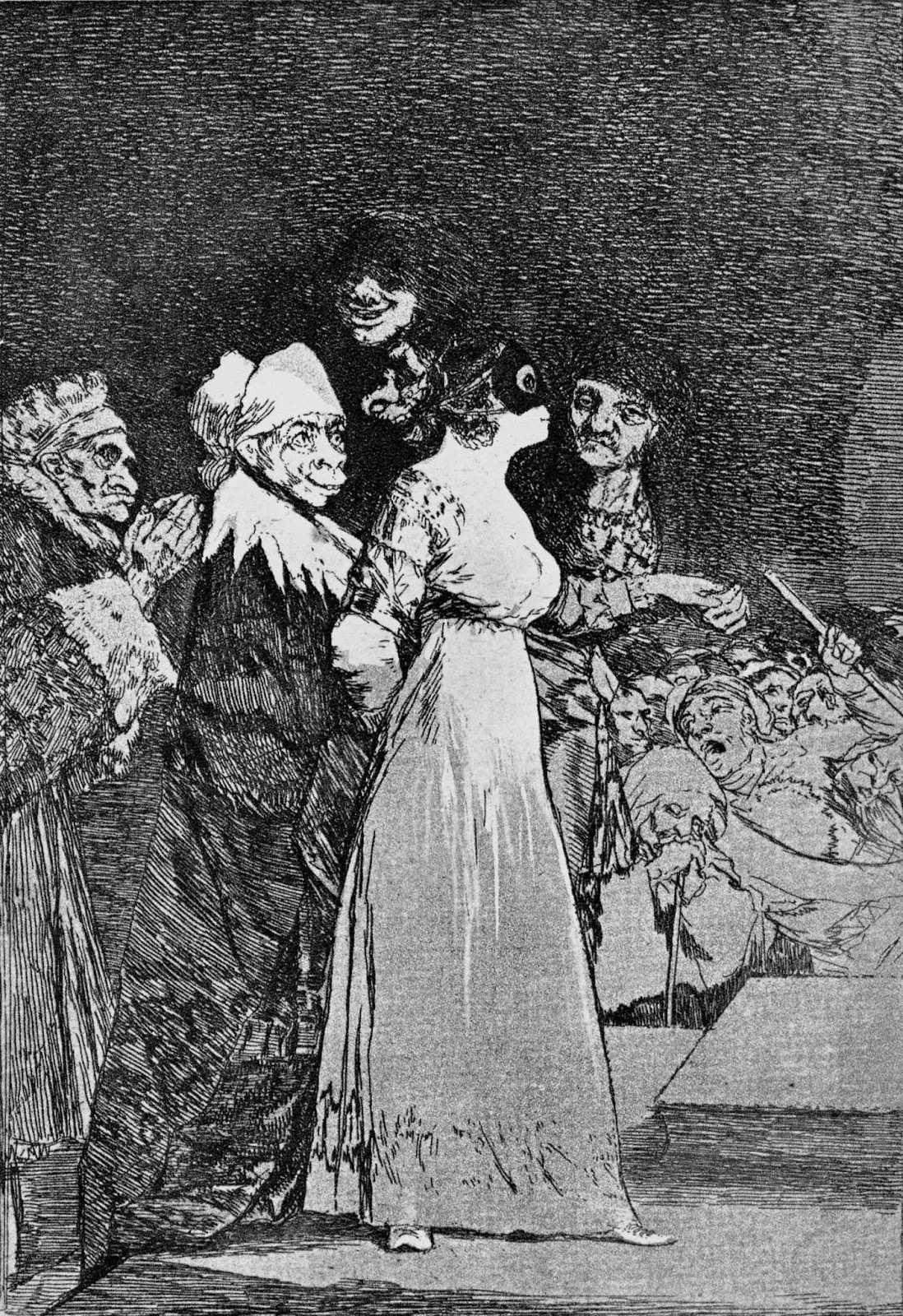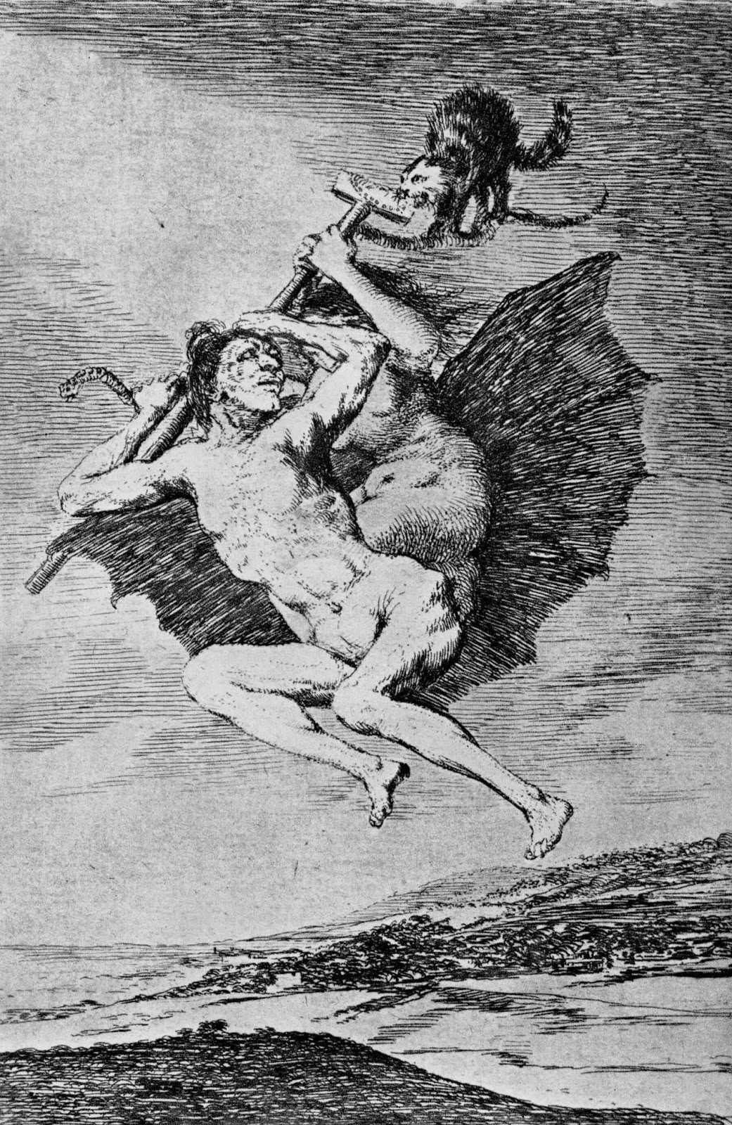 Гойя жил, когда Инквизиция ещё процветала. В Испании ведьм сжигали редко. Но могли неугодной женщине сильно попортить жизнь. Заточить на много лет в тюрьму. Или провести полуголую по улицам. Что собственно и показано на данной гравюре.