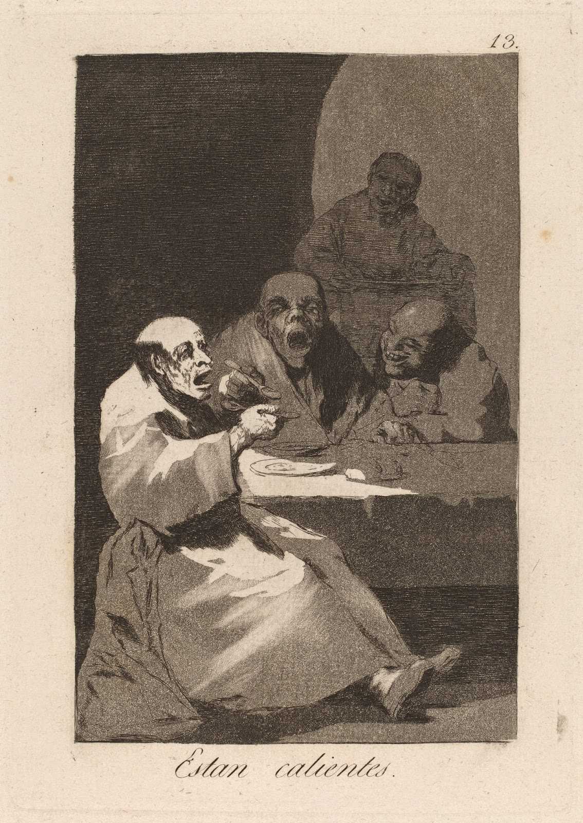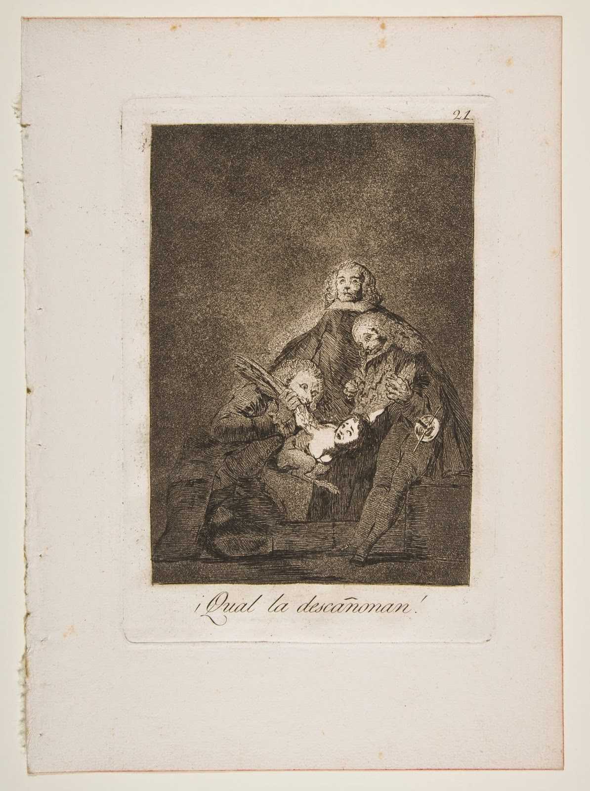 Чтобы вы не подумали, что Гойя сексист, взгляните на другую гравюру (21). На ней уже ощипывают птичку женского рода. А делают это лживые и алчные сеньоры.