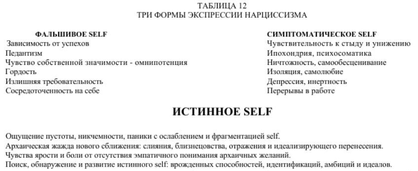 То есть жизнь нарцисса постепенно превращается в кровавый бой истинного self с фальшивым self. Причем у истинного self есть ядерный чемоданчик – симптоматическое self. Это довольно непростая шарада, которую часто приходиться разгадывать с помощью профессионала.
