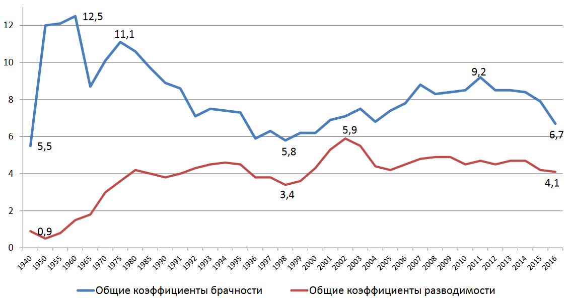 - Самым оптимальным периодом были 50-е года, когда коэффициент брачности достигал 12,5.