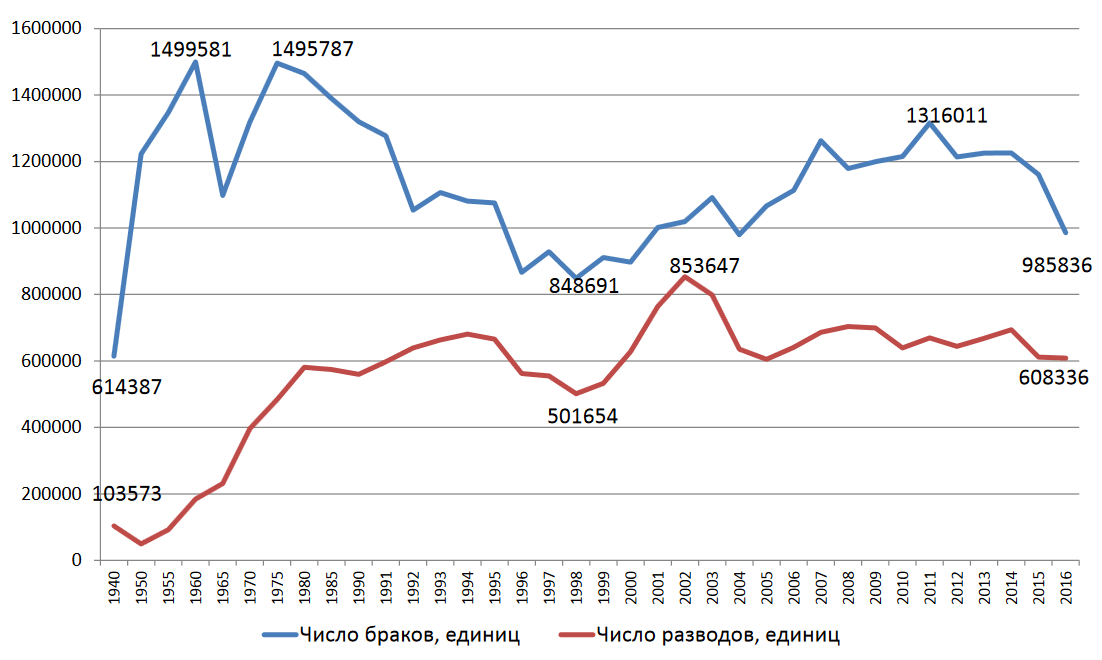 Рассматривая статистику по количеству браков и разводов в России с 1940 года по 2016 в процентах, стоит выделить следующую закономерность: