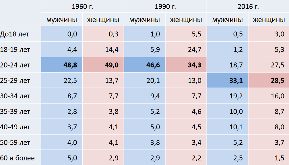 - Количество свадеб в возрасте от 20 до 24 лет в шестидесятых годах составляла приблизительно 48–49%.