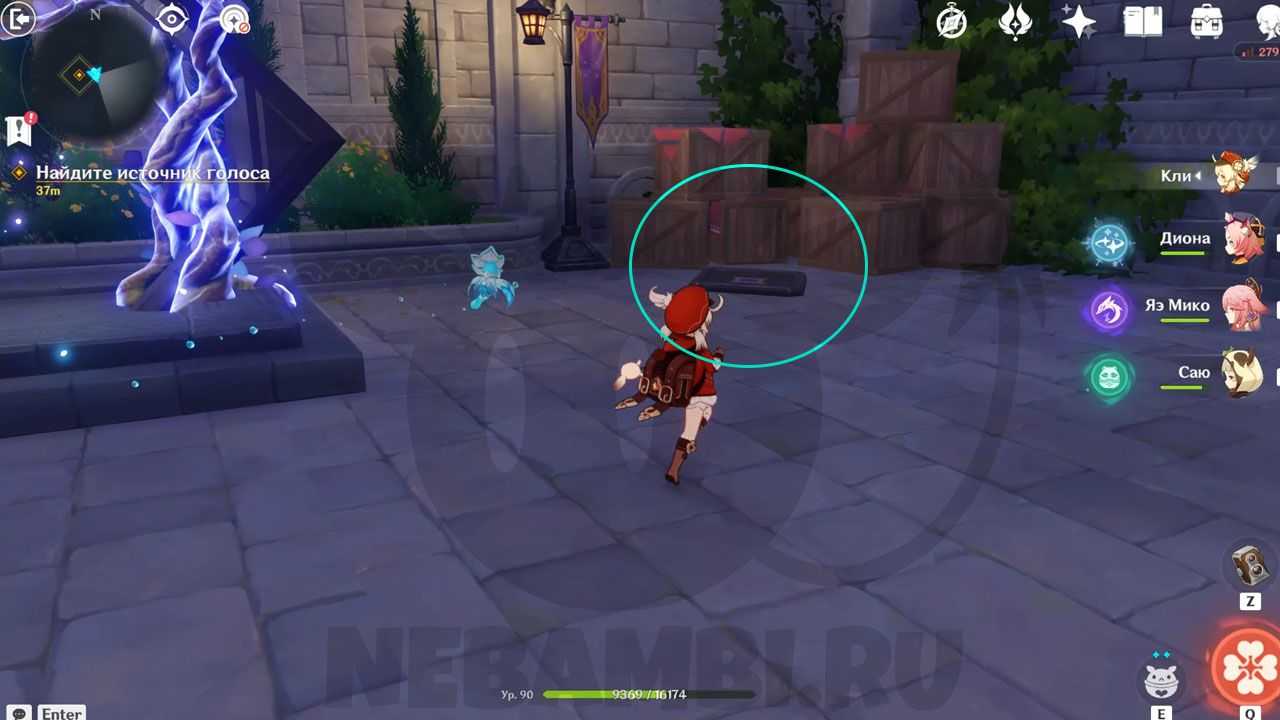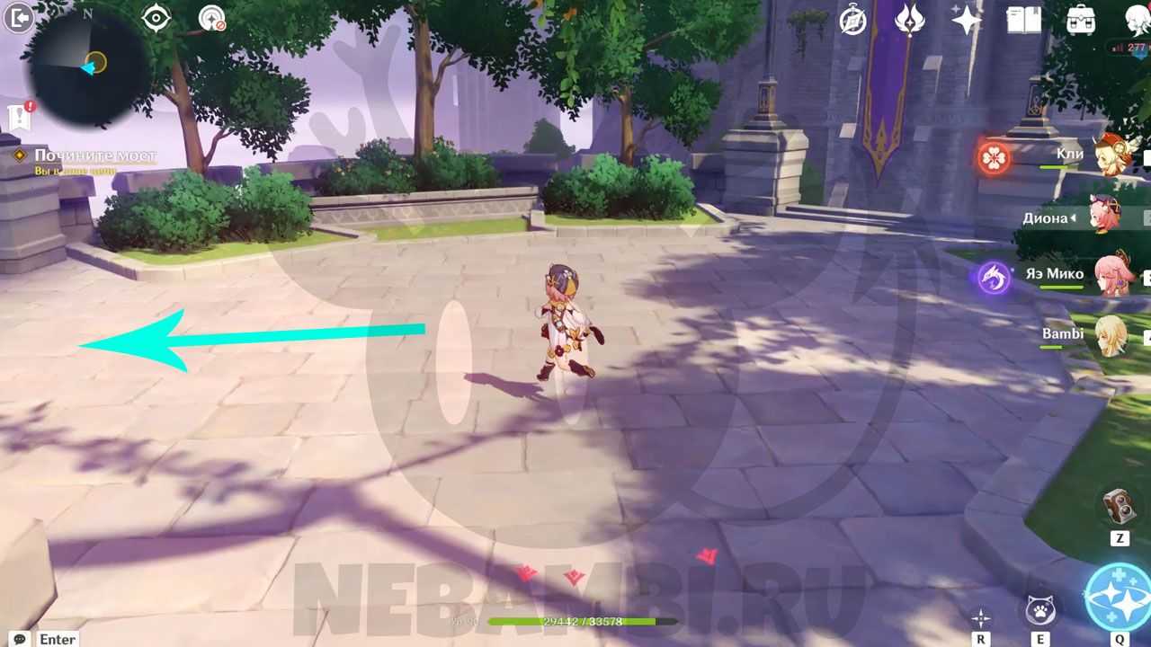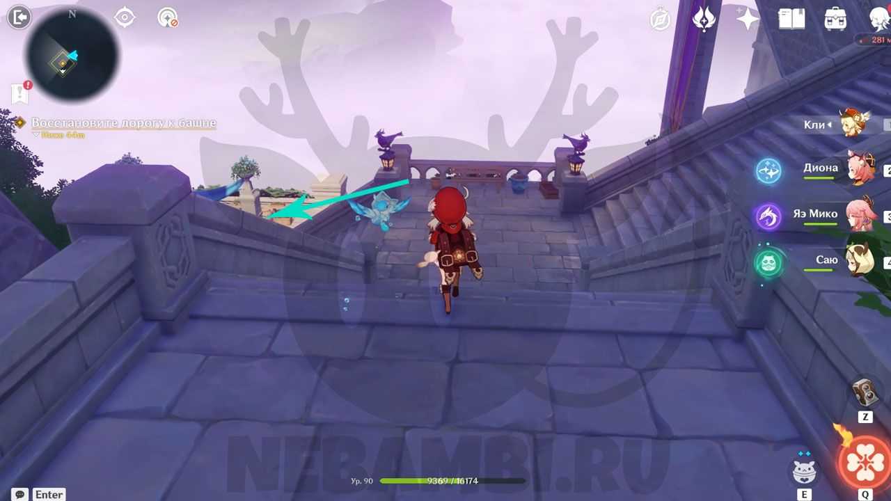 Сначала поднимитесь на лифте справа от врат, поднимитесь по лестнице справа и бегите к хиличурлам.